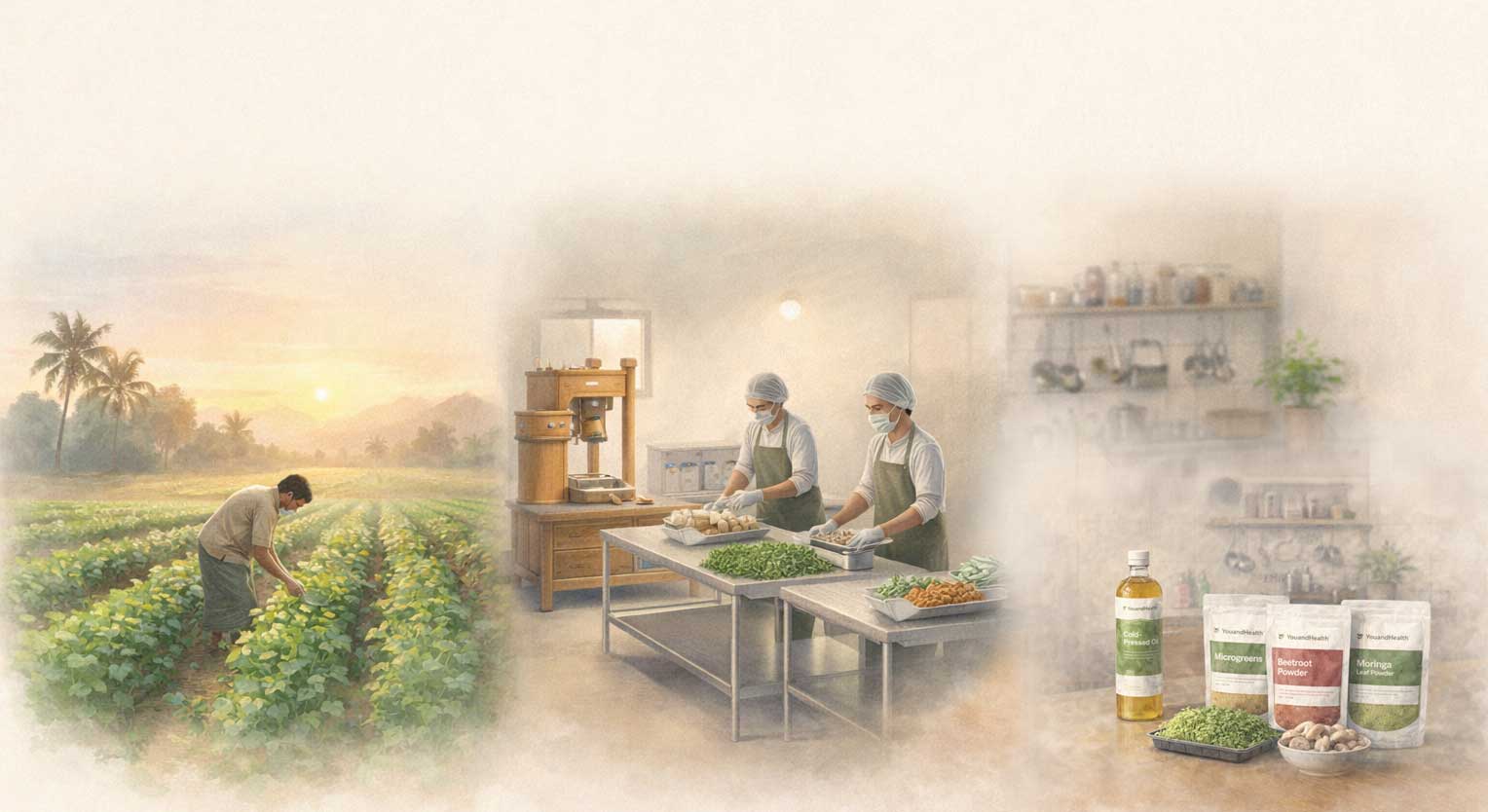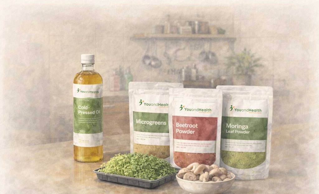 At YouandHealth, every oil bottle, mushroom box, tray of microgreens and pouch of powder comes from a clear, simple process. We grow in small, trusted farms, handle everything in hygienic units and keep each step as natural as possible. So you always know what’s coming into your kitchen.