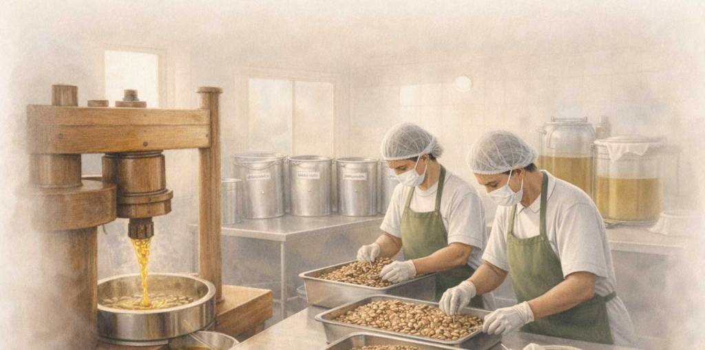 Seeds are pressed in a traditional wooden ghana at low RPM to minimise heat, which helps preserve natural aroma, taste and nutrients.