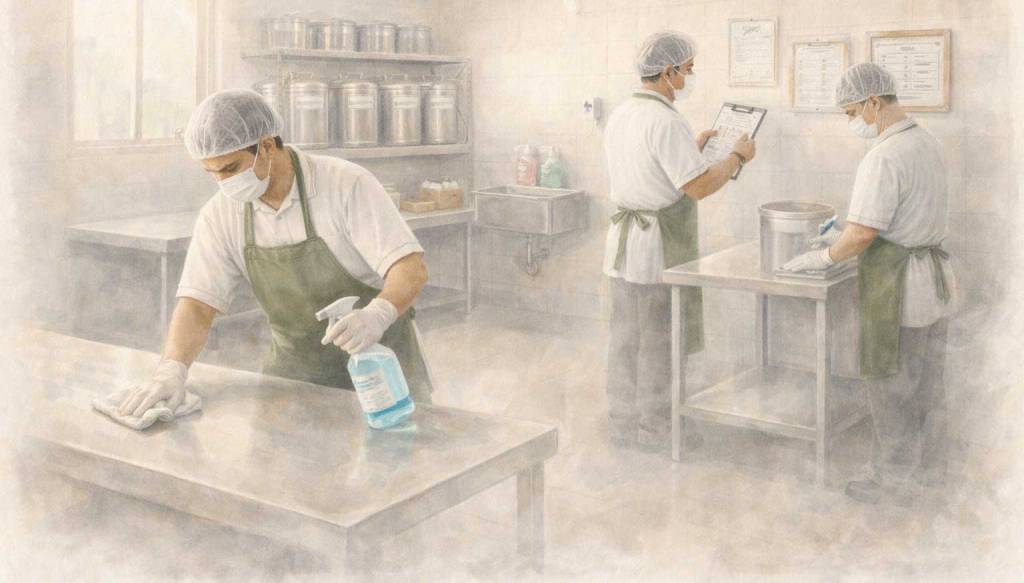 Staff use hairnets, gloves and dedicated aprons inside production areas.